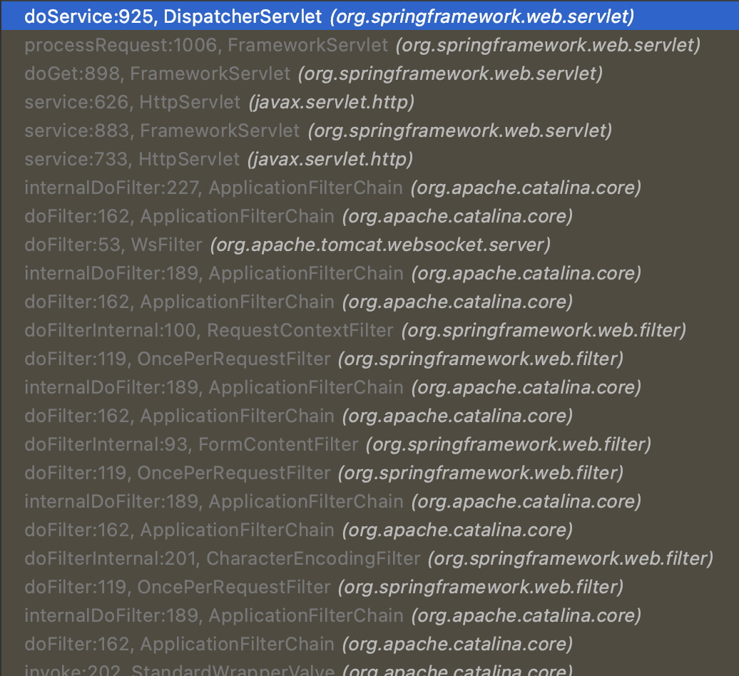 호출 스택을 확인하면 DispatcherServlet을 FrameworkServlet에서 호출하고,