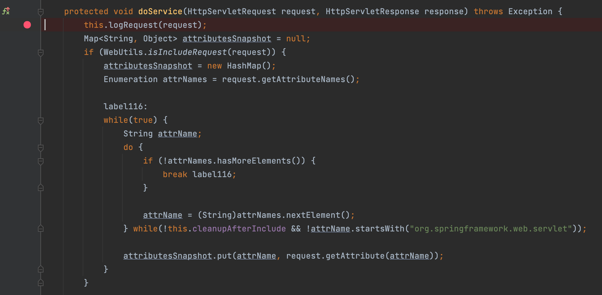 그림처럼 요청을 처리하는 가장 핵심부분이 되는 DispatcherService의 doService() 메서드에 Break Point을 찍었다.